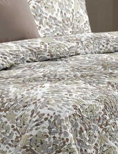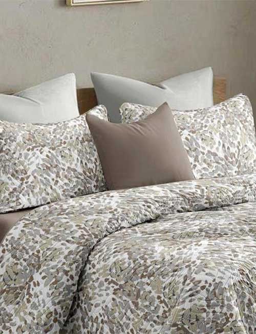 Colcha doble vista con diseño estampado en tonos mocha, verde olivo y gris medio sobre fondo blanco, que aporta un estilo sobrio, moderno y elegante al dormitorio. El reverso en color mocha sólido complementa el diseño y permite cambiar la apariencia del espacio de forma sencilla según el ambiente deseado.