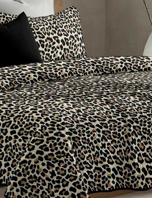 Colcha doble vista con diseño estampado de manchas estilo leopardo sobre fondo claro, que aporta una estética audaz, moderna y con personalidad. El patrón animal print crea un contraste elegante y decorativo, ideal para espacios que buscan un toque distintivo sin perder equilibrio visual. El reverso en color negro sólido complementa el diseño y permite cambiar la apariencia del dormitorio de forma sencilla y sofisticada.