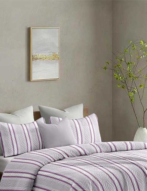 Colcha doble vista con diseño estampado de rayas en tonos morado, blanco y gris medio sobre fondo lila, que aporta un estilo moderno, equilibrado y visualmente ordenado. La combinación de colores genera una atmósfera suave y contemporánea, ideal para crear espacios relajantes y bien armonizados. El reverso en color lila sólido complementa el diseño y permite cambiar la apariencia del dormitorio de forma sencilla.