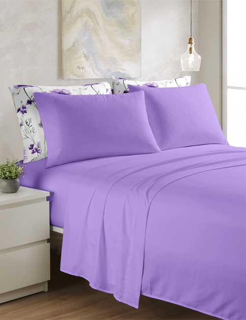 Este juego incluye piezas estampadas y lisas, permitiendo variar la presentación de la cama según el estilo que se desee lograr. Las sábanas lisas en color lila complementan perfectamente el diseño floral, brindando una apariencia coordinada y agradable.